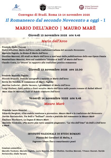 Nel triennio 2025-2027 il Centro Studi Giuseppe Gioachino Belli promuove e organizza un ciclo di convegni dedicati a percorrere la storia della poesia in dialetto Romanesco dalla seconda metà del Novecento a oggi. Il convegno del 2025 è dedicato a Mario dell’Arco e Mauro Marè.